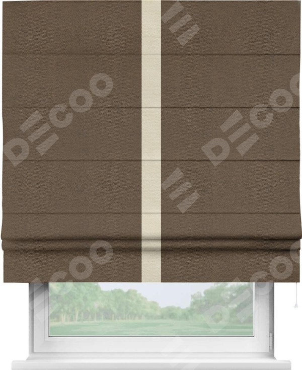 Римская штора производителя «Cortin», используется для проёма, пошита из ткани лён димаут тёмно-коричневый, артикул 83 030. Отделка шторы кантом «Хайвэй», ткань для канта используется из льна димаут разной расцветки на выбор. Имеет универсальный механизм и подходит для монтажа: на потолок, на стену и в нишу.