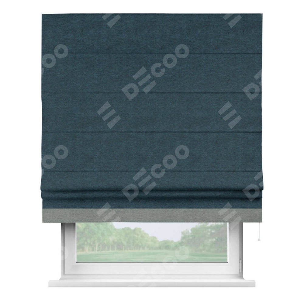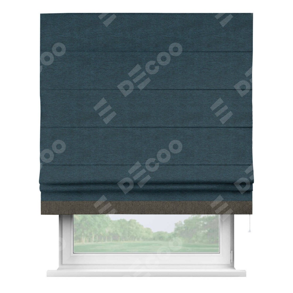 Римская штора производителя «Cortin», используется для проёма, пошита из ткани твид блэкаут глубокий синий, артикул 21590. Отделка шторы кантом «Джестер», ткань для канта используется из твида разной расцветки на выбор. Имеет универсальный механизм и подходит для монтажа: на потолок, на стену и в нишу.