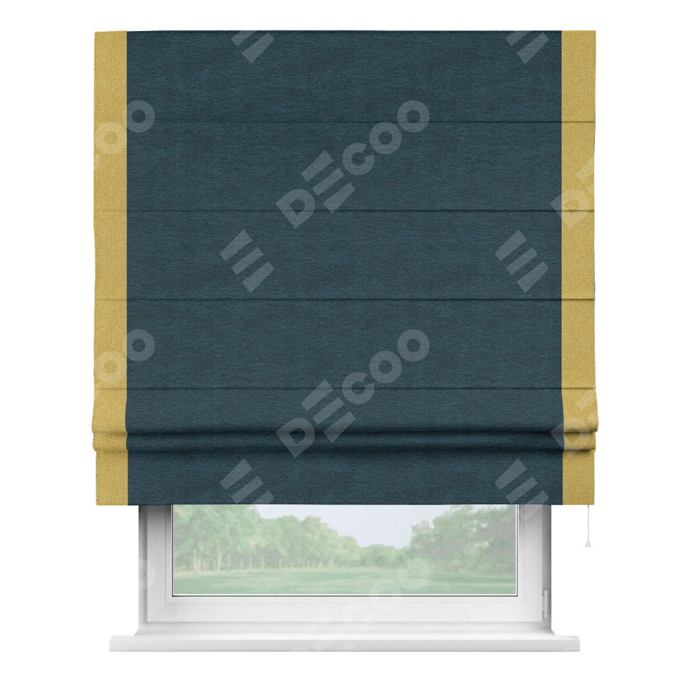 Римская штора производителя «Cortin», используется для проёма, пошита из ткани твид блэкаут глубокий синий, артикул 21590. Отделка шторы кантом «Стрим Дуо», ткань для канта используется из твида разной расцветки на выбор. Имеет универсальный механизм и подходит для монтажа: на потолок, на стену и в нишу.