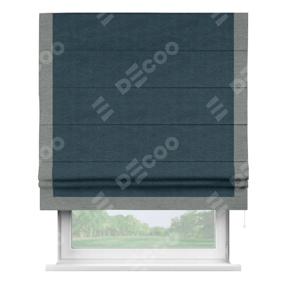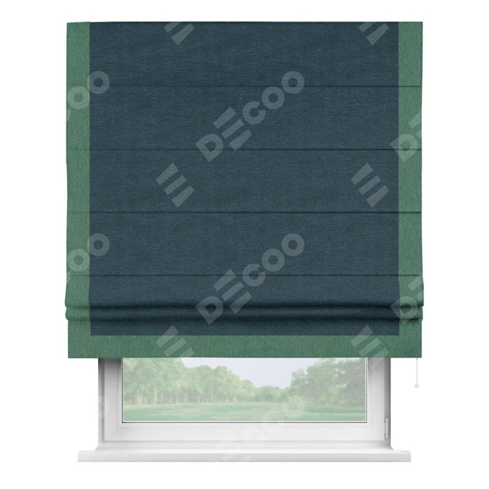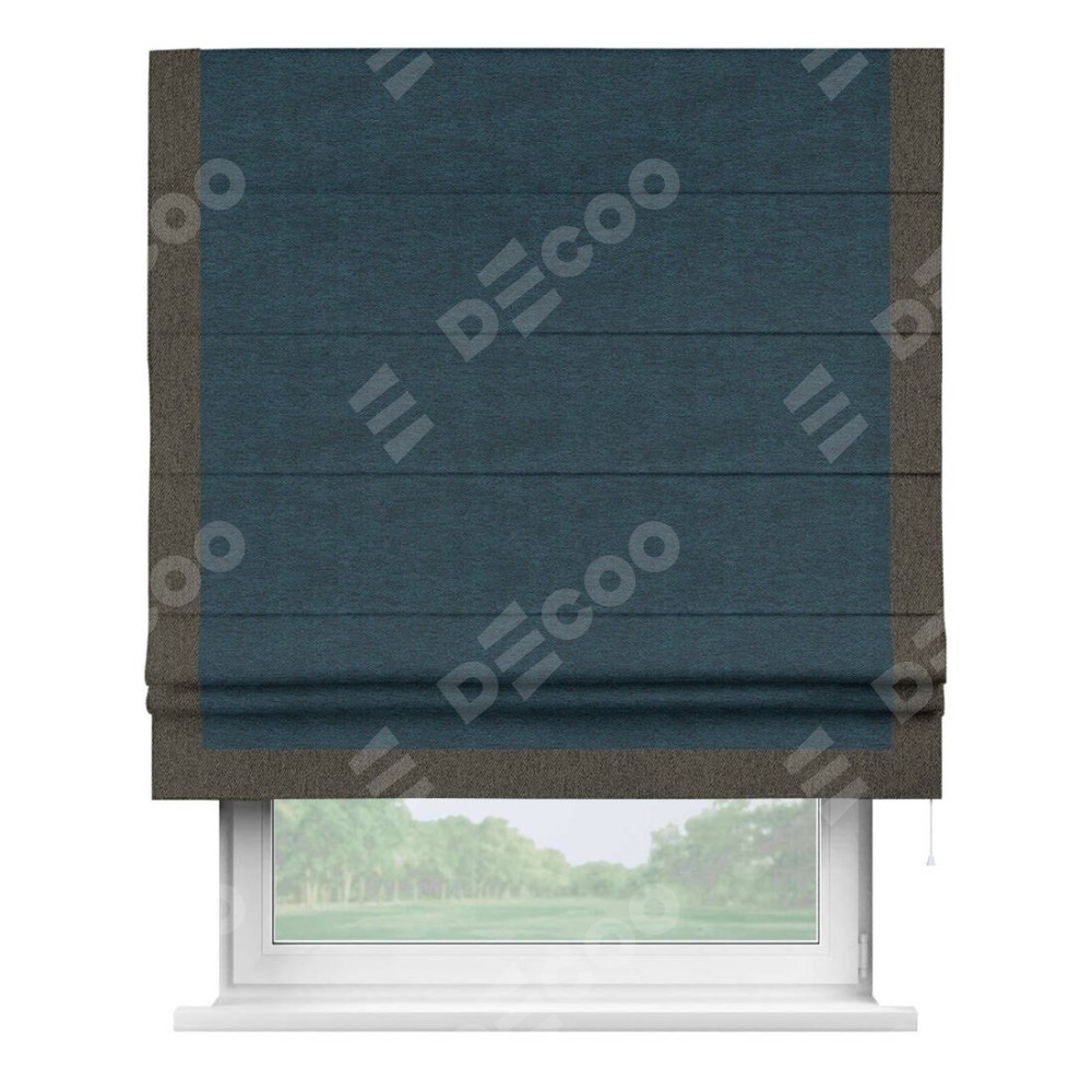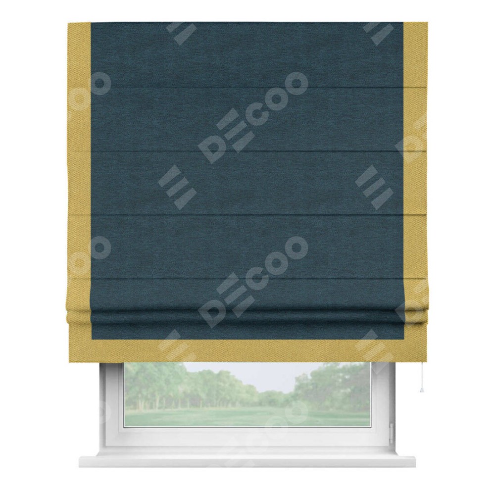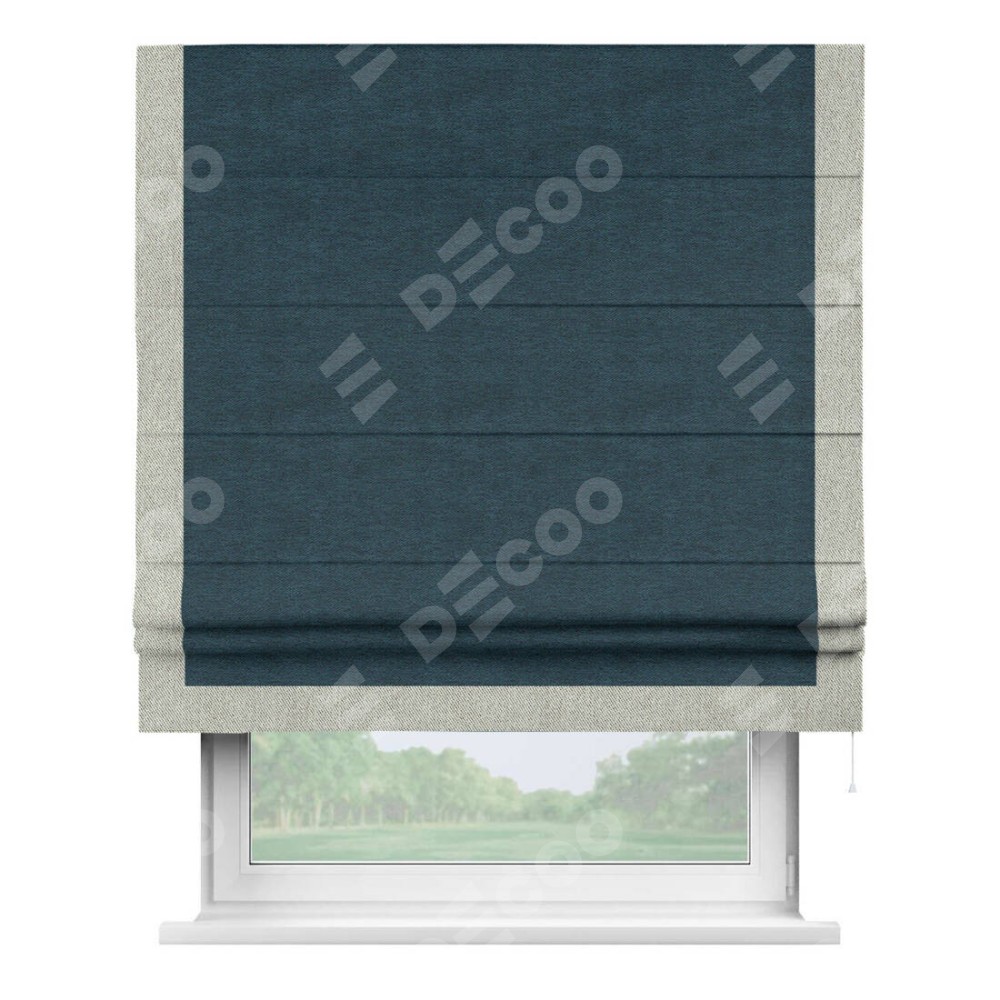 Римская штора производителя «Cortin», используется для проёма, пошита из ткани твид блэкаут глубокий синий, артикул 21590. Отделка шторы кантом «Виктория», ткань для канта используется из твида разной расцветки на выбор. Имеет универсальный механизм и подходит для монтажа: на потолок, на стену и в нишу.