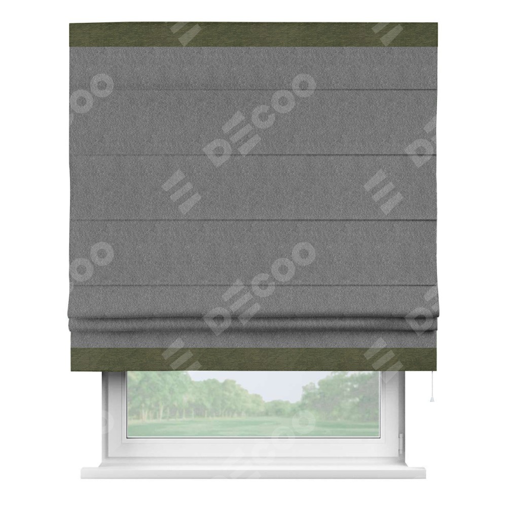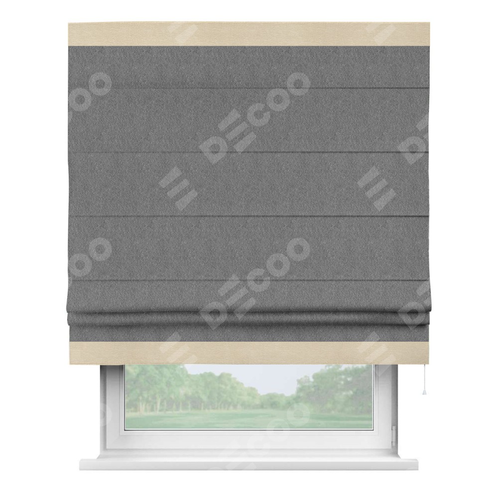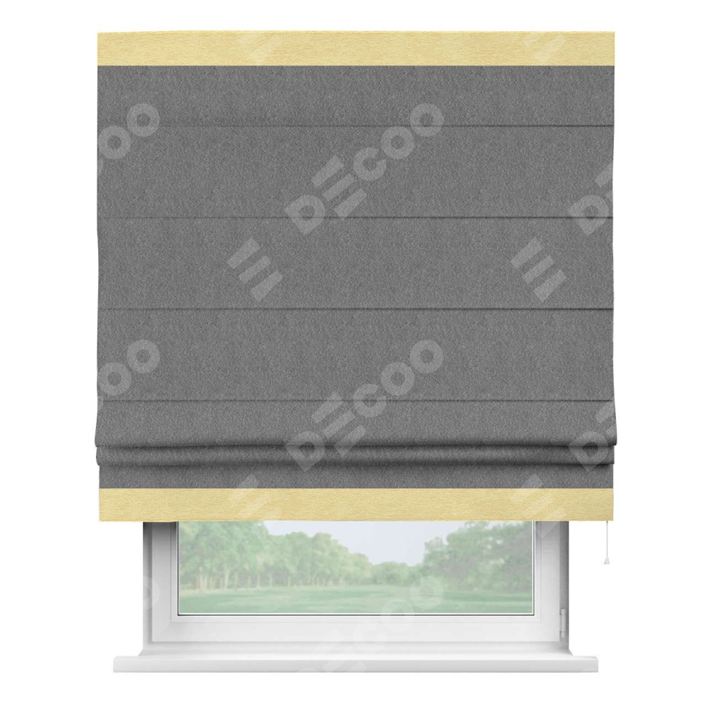 Римская штора производителя «Cortin», используется для проёма, пошита из ткани софт однотонный серый, артикул 70605. Отделка шторы кантом «Горизонт», ткань для канта используется из софта разной расцветки на выбор. Имеет универсальный механизм и подходит для монтажа: на потолок, на стену и в нишу.