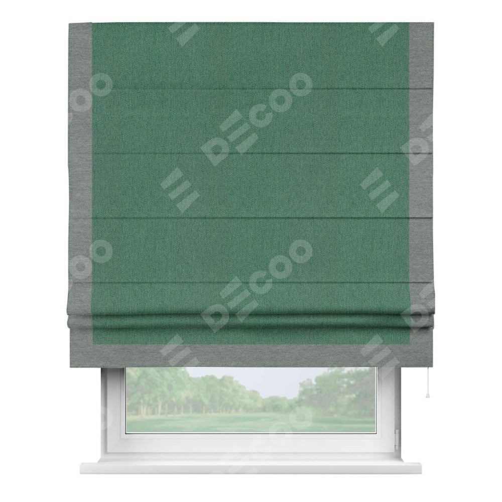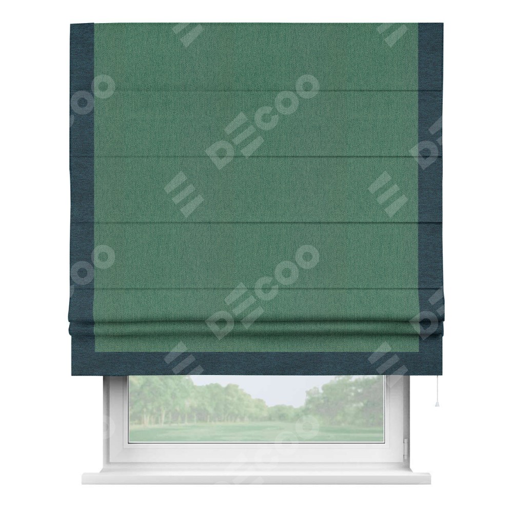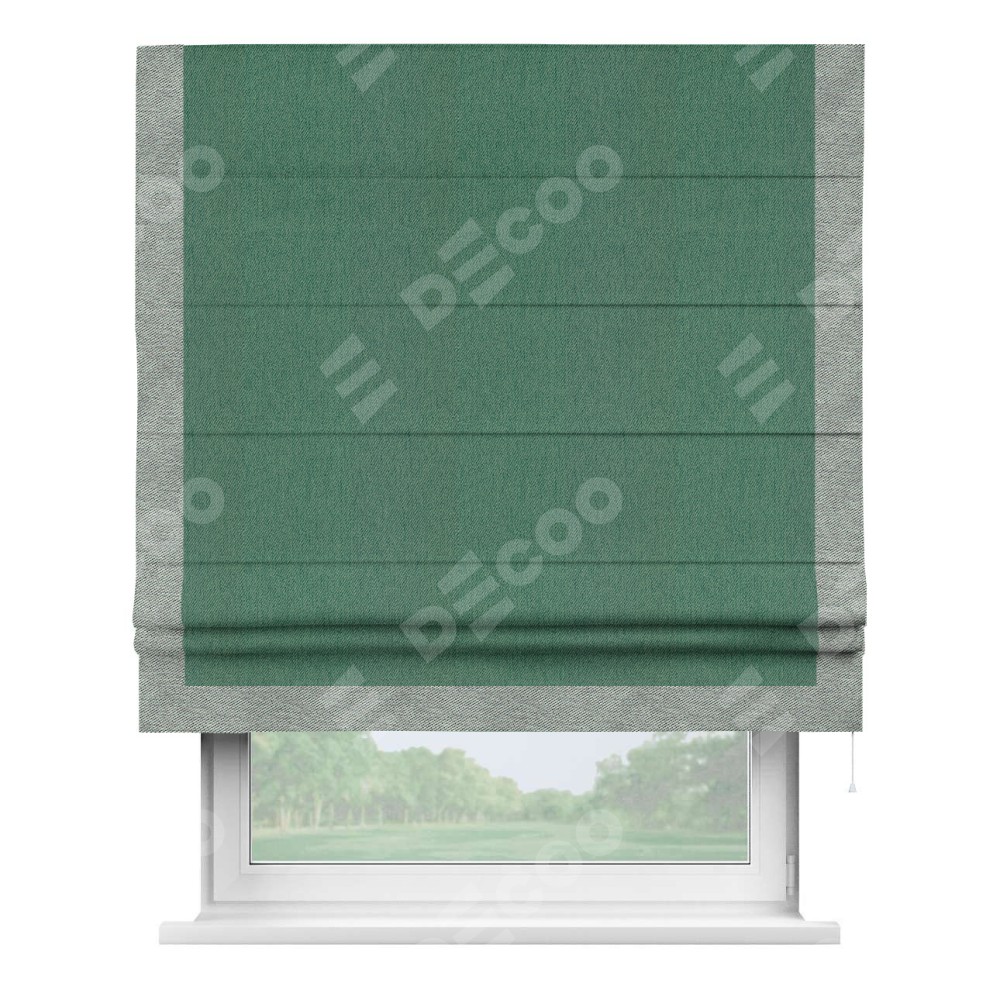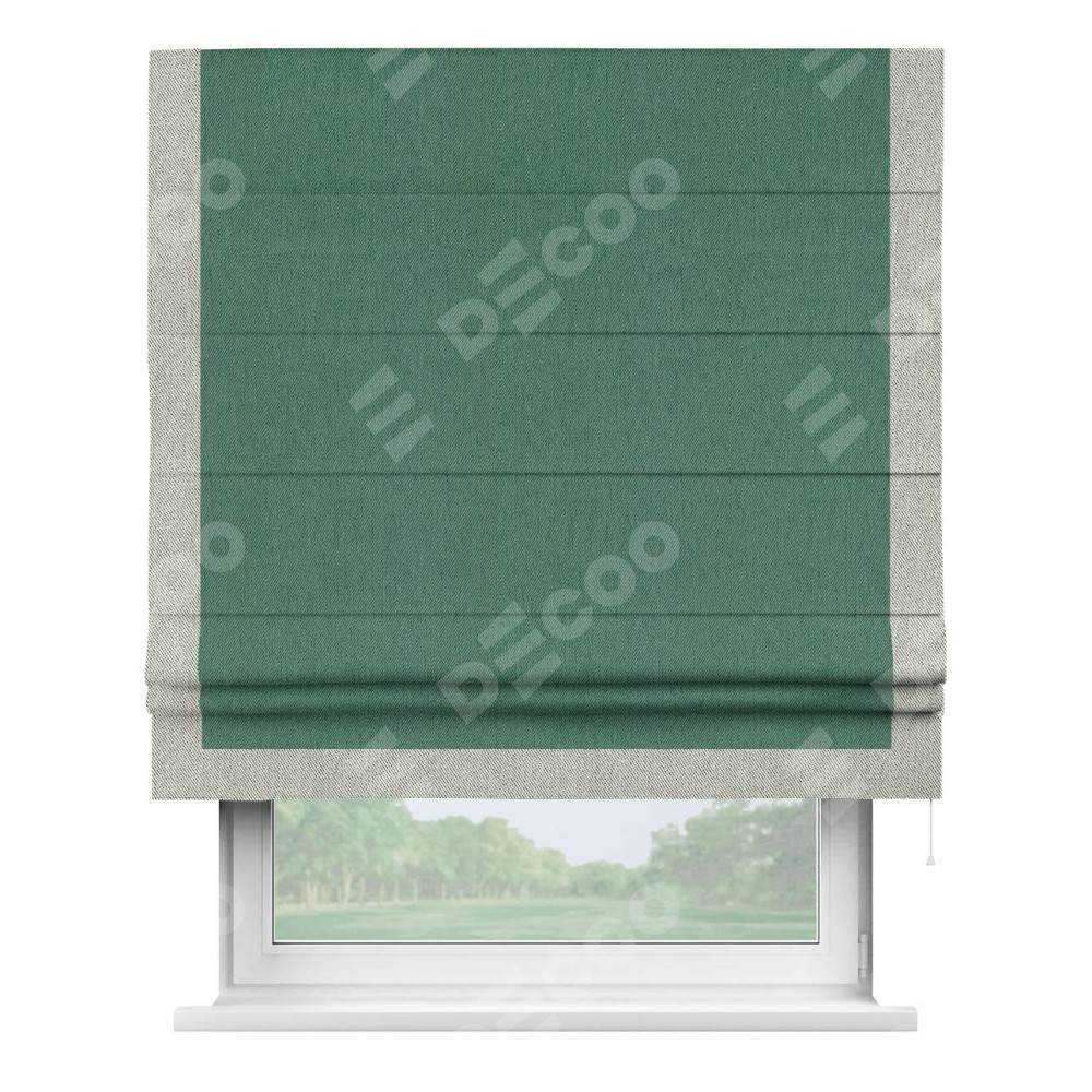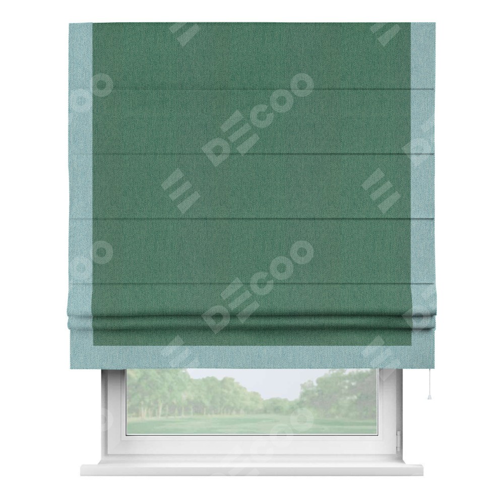 Римская штора производителя «Cortin», используется для проёма, пошита из ткани твид блэкаут зелёный, артикул 21589. Отделка шторы кантом «Виктория», ткань для канта используется из твида разной расцветки на выбор. Имеет универсальный механизм и подходит для монтажа: на потолок, на стену и в нишу.