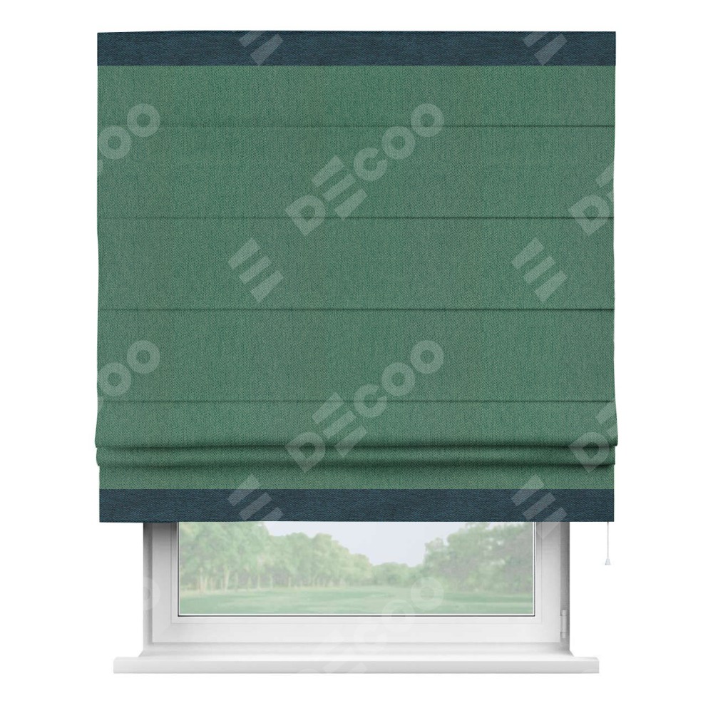 Римская штора производителя «Cortin», используется для проёма, пошита из ткани твид блэкаут зелёный, артикул 21589. Отделка шторы кантом «Горизонт», ткань для канта используется из твида разной расцветки на выбор. Имеет универсальный механизм и подходит для монтажа: на потолок, на стену и в нишу.