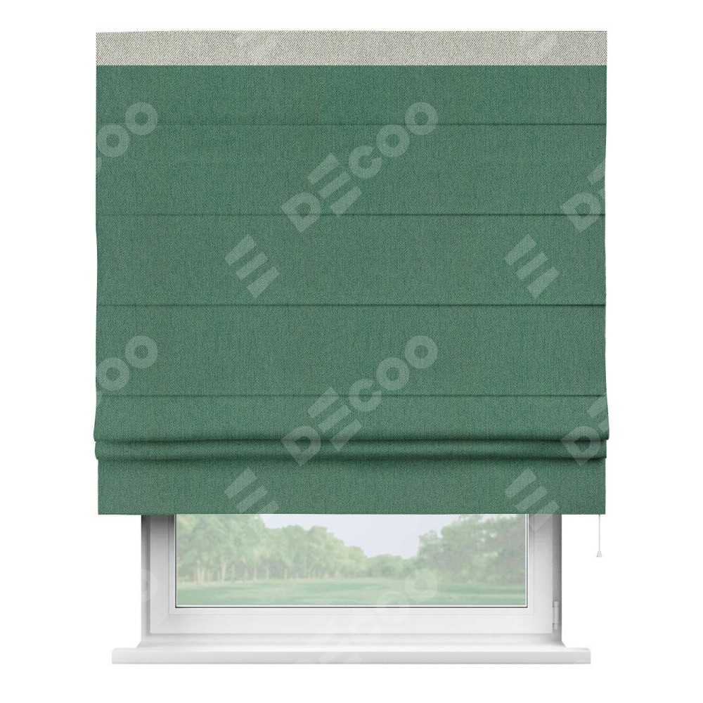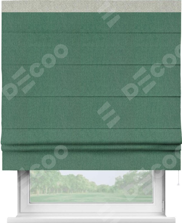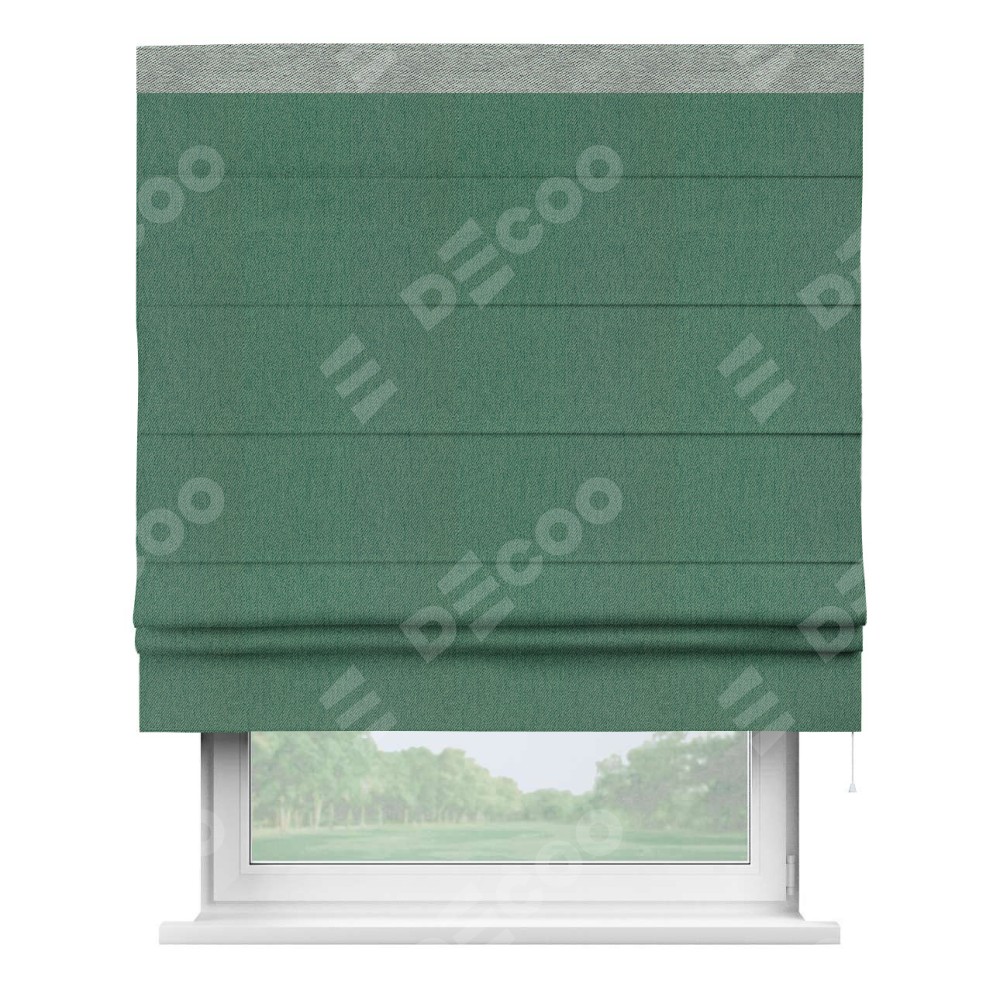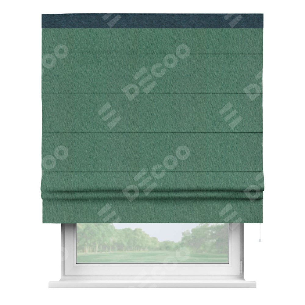 Римская штора производителя «Cortin», используется для проёма, пошита из ткани твид блэкаут зелёный, артикул 21589. Отделка шторы кантом «Кинг», ткань для канта используется из твида разной расцветки на выбор. Имеет универсальный механизм и подходит для монтажа: на потолок, на стену и в нишу.