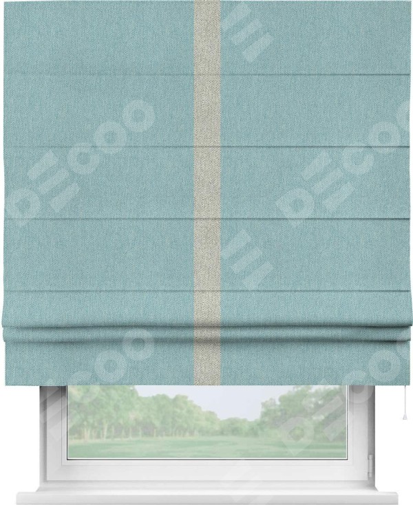 Римская штора производителя «Cortin», используется для проёма, пошита из ткани твид блэкаут небесно-голубой, артикул 21578. Отделка шторы кантом «Хайвэй», ткань для канта используется из твида разной расцветки на выбор. Имеет универсальный механизм и подходит для монтажа: на потолок, на стену и в нишу.