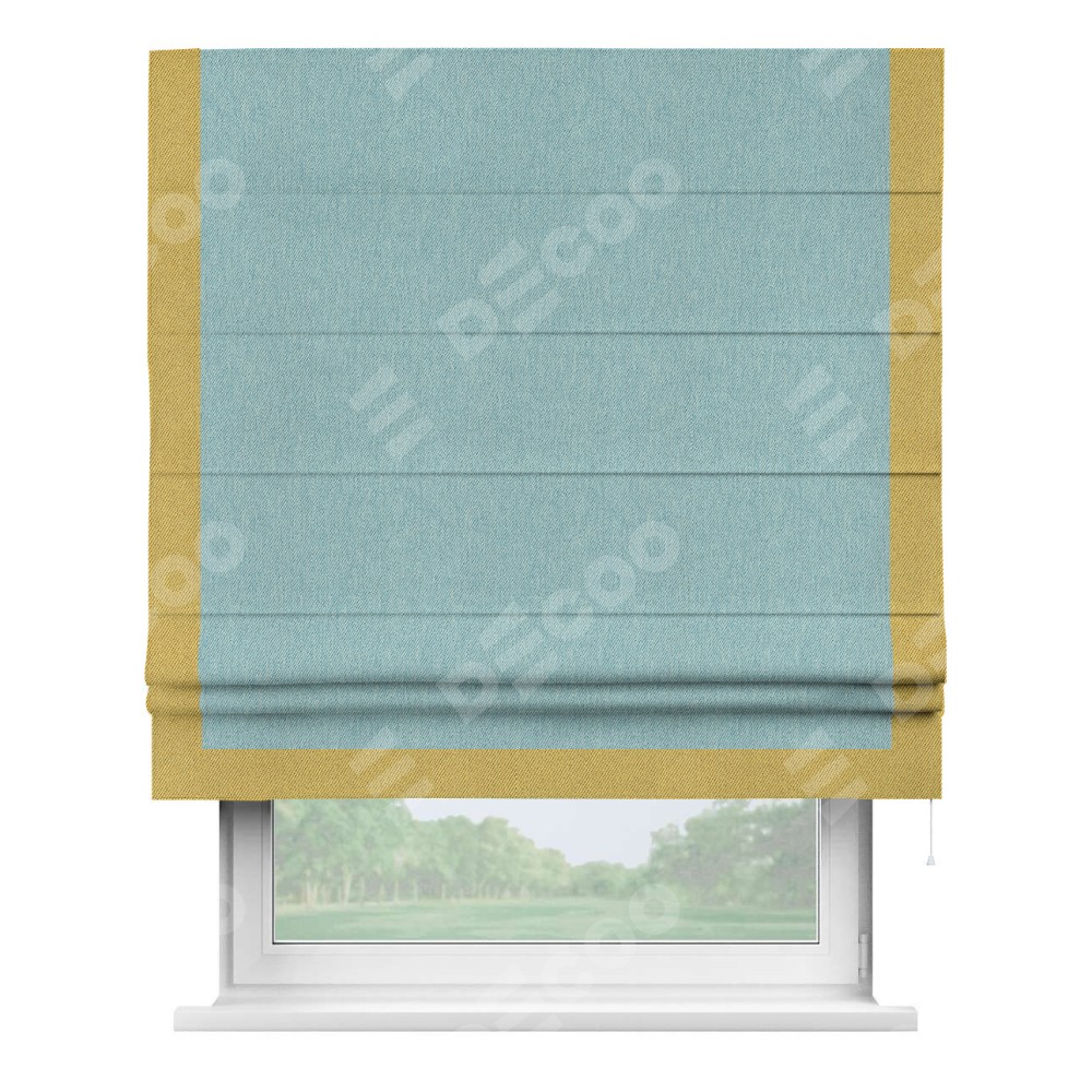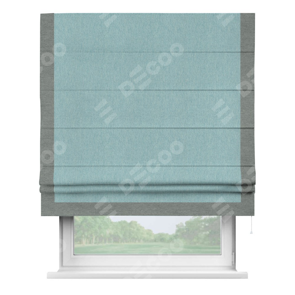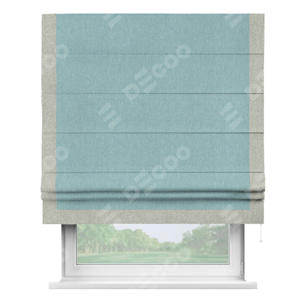 Римская штора производителя «Cortin», используется для проёма, пошита из ткани твид блэкаут небесно-голубой, артикул 21578. Отделка шторы кантом «Виктория», ткань для канта используется из твида разной расцветки на выбор. Имеет универсальный механизм и подходит для монтажа: на потолок, на стену и в нишу.