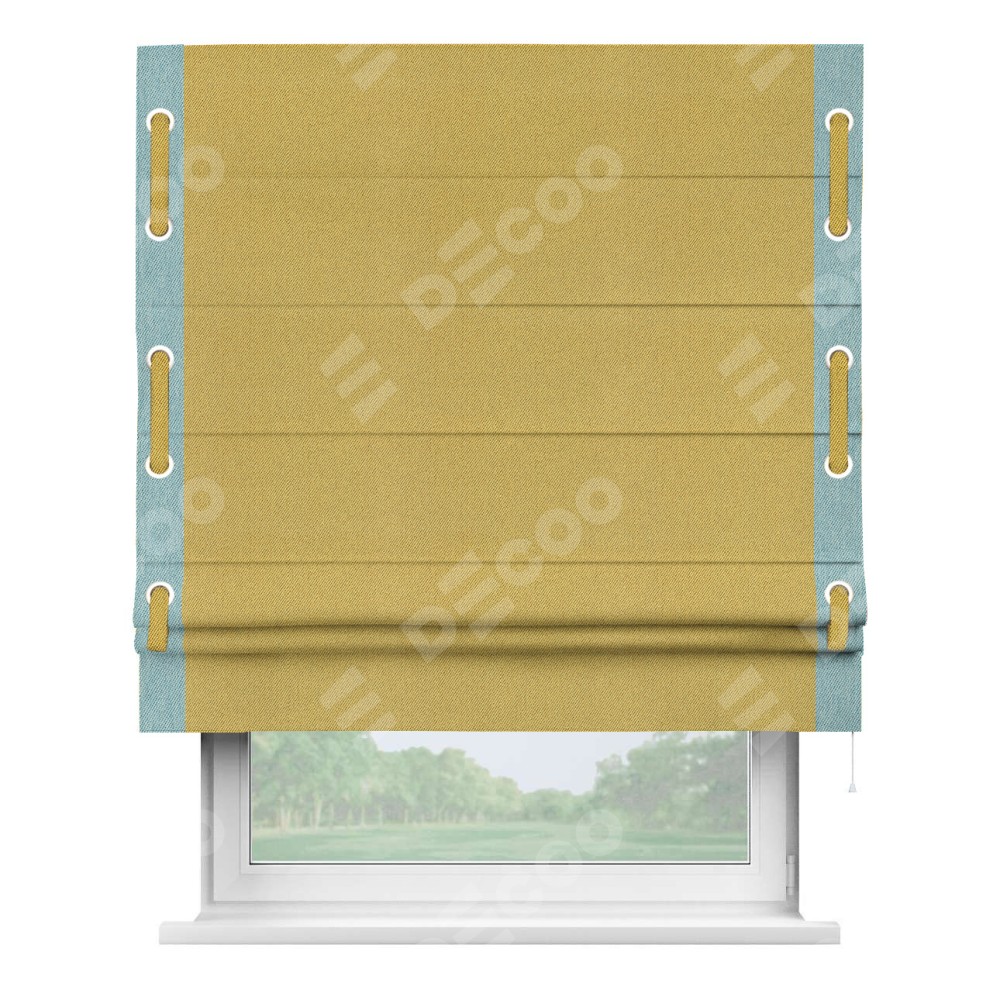 Римская штора производителя «Cortin», используется для проёма, пошита из ткани твид блэкаут пыльная горчица, артикул 21588. Отделка шторы кантом «Стрим Дуо» на кантах расположены люверсы с пояском, ткань для канта используется из твида разной расцветки на выбор. Ткань для пояска обычно используется из основной ткани шторы, а так же можно сделать из любой расцветки по желанию. Имеет универсальный механизм и подходит для монтажа: на потолок, на стену и в нишу.