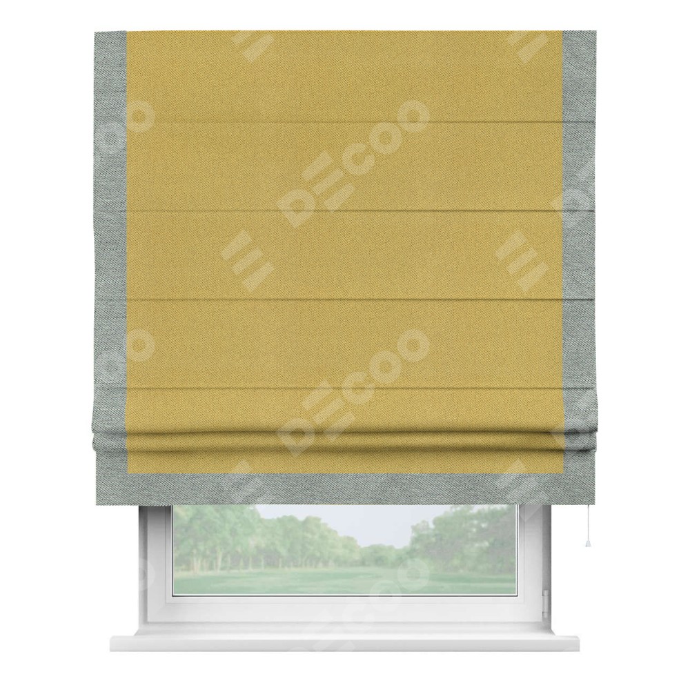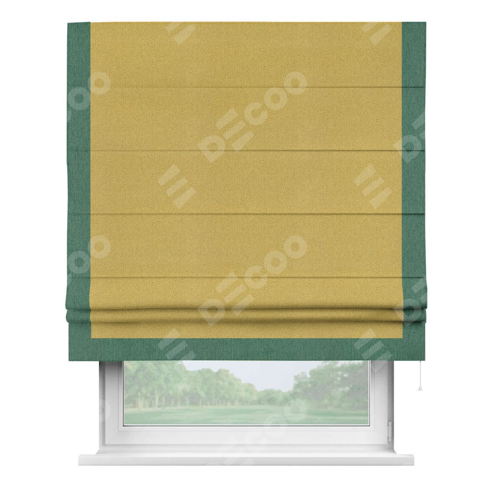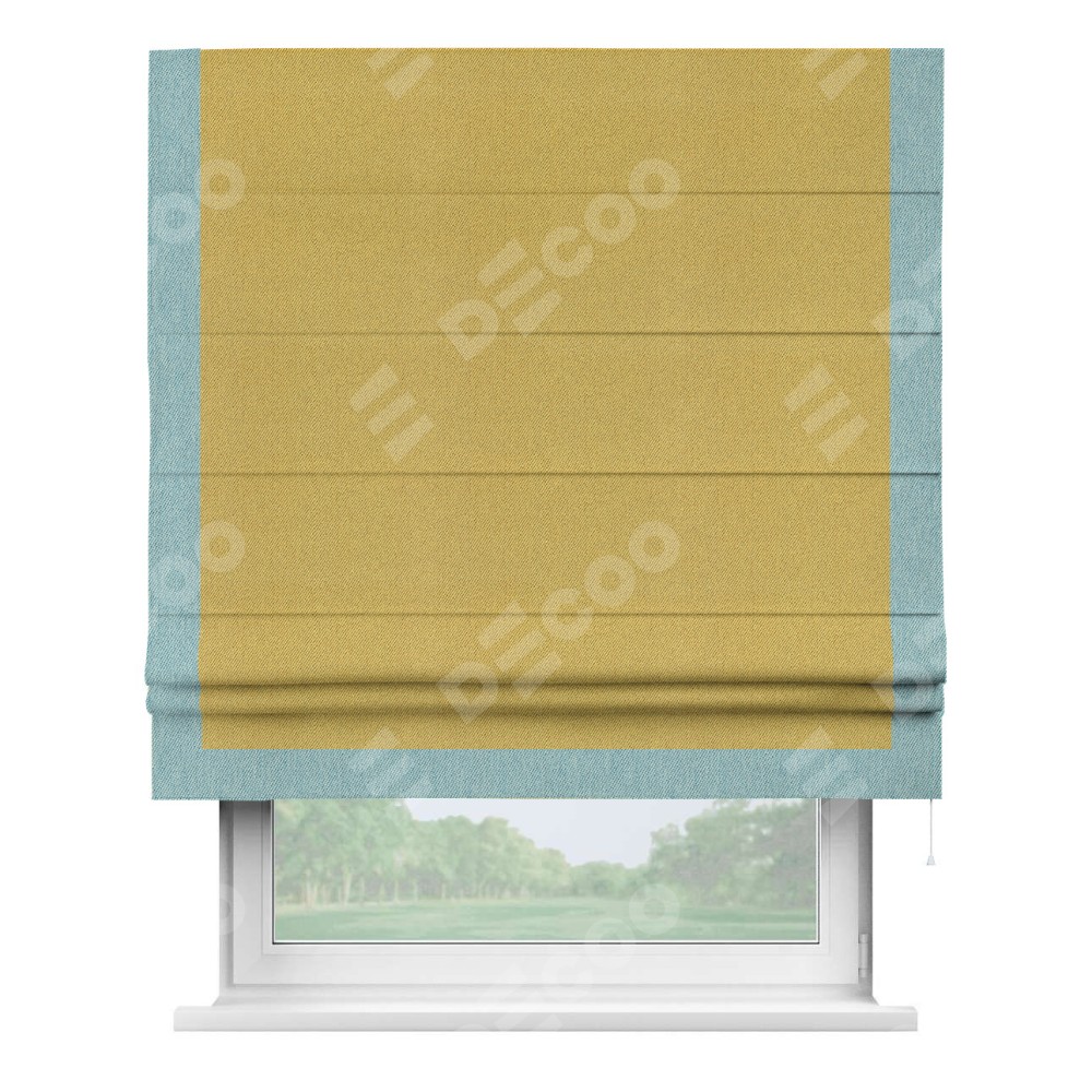 Римская штора производителя «Cortin», используется для проёма, пошита из ткани твид блэкаут пыльная горчица, артикул 21588. Отделка шторы кантом «Виктория», ткань для канта используется из твида разной расцветки на выбор. Имеет универсальный механизм и подходит для монтажа: на потолок, на стену и в нишу.