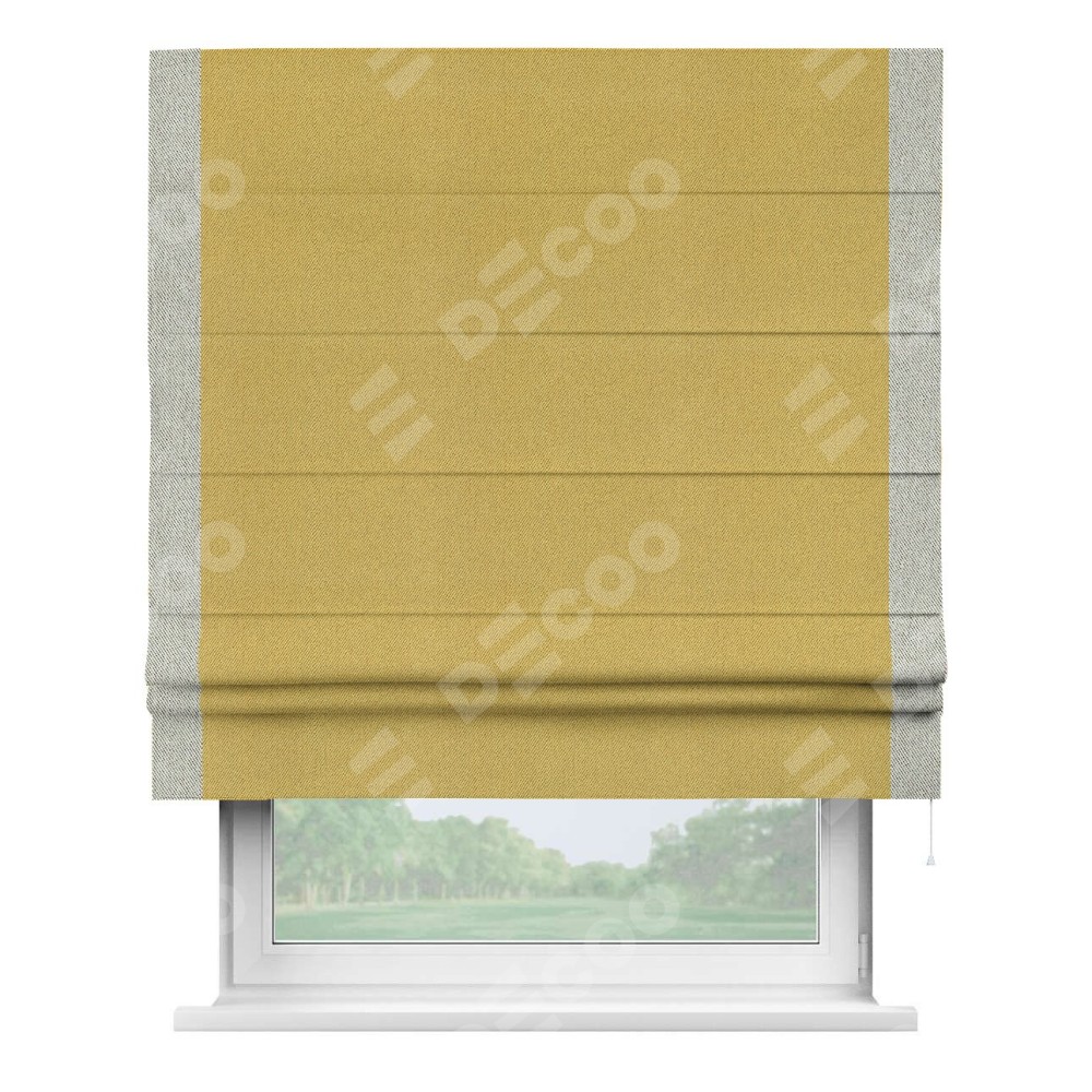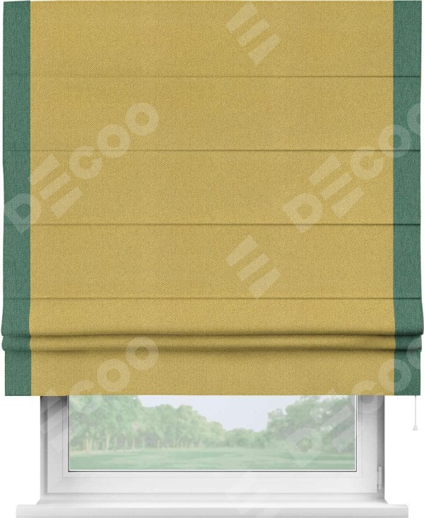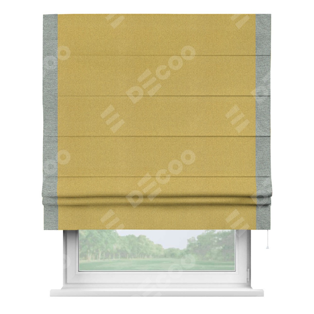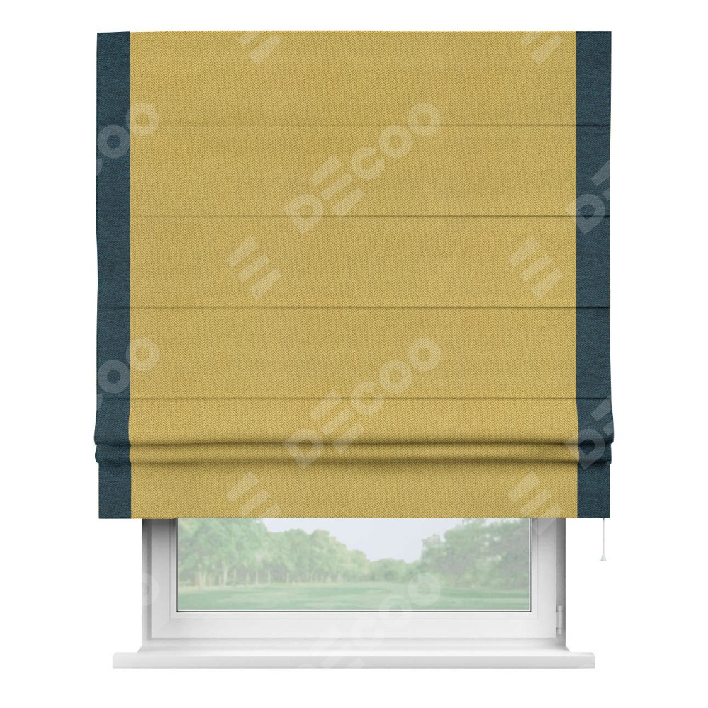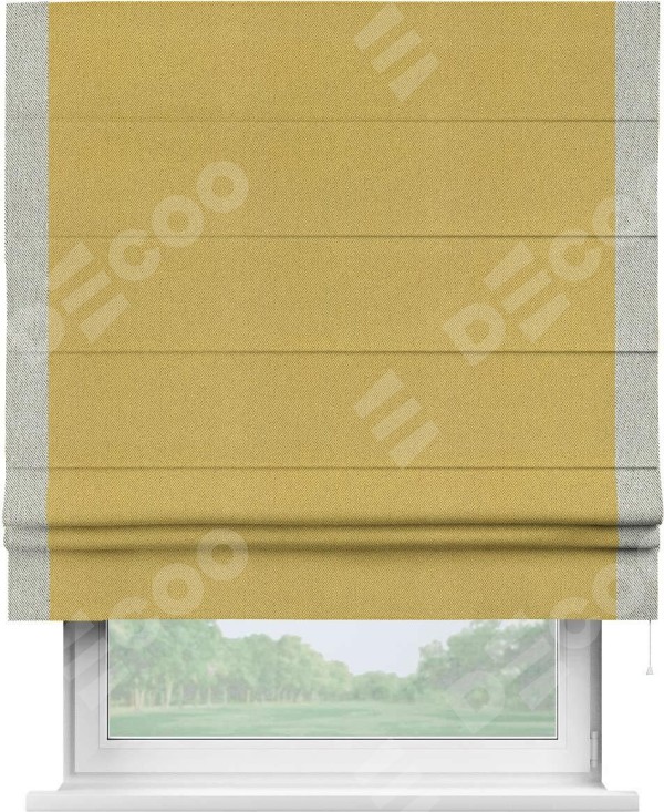 Римская штора производителя «Cortin», используется для проёма, пошита из ткани твид блэкаут пыльная горчица, артикул 21588. Отделка шторы кантом «Стрим Дуо», ткань для канта используется из твида разной расцветки на выбор. Имеет универсальный механизм и подходит для монтажа: на потолок, на стену и в нишу.