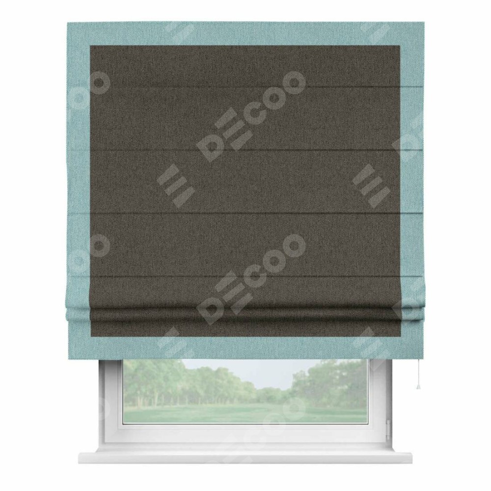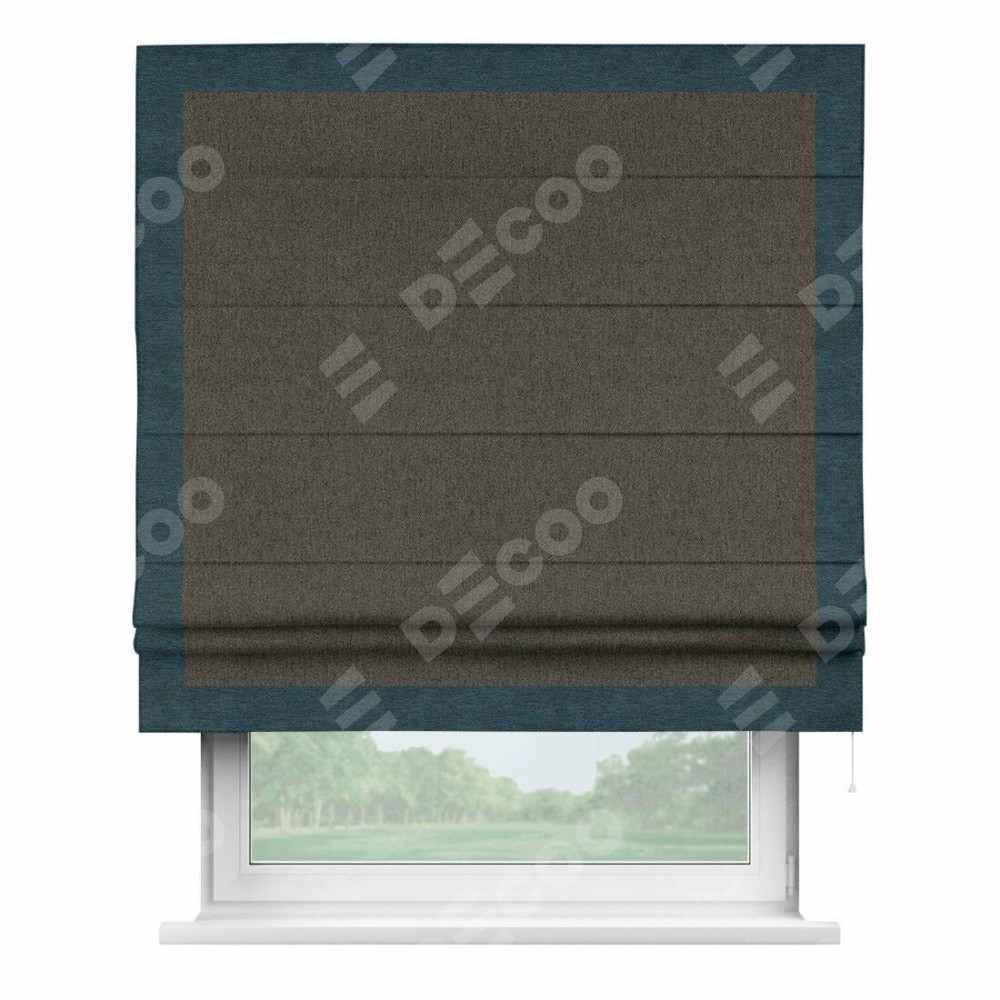 Римская штора производителя «Cortin», используется для проёма, пошита из ткани твид блэкаут тёмно-коричневый, артикул 21584. Отделка шторы кантом «Чесс», ткань для канта используется из твида разной расцветки на выбор. Имеет универсальный механизм и подходит для монтажа: на потолок, на стену и в нишу.