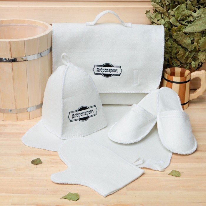 Для комфортного отдыха в парной возьмите с собой набор банных принадлежностей. Предметы из этого комплекта предохраняют тело от перегрева и являются средствами индивидуального пользования. Влажные изделия рекомендуется сушить в расправленном виде на горизонтальной поверхности. Принадлежности из войлока и фетра стирайте вручную при температуре воды 30 °C.