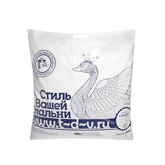 Ткань верха: пуходержащий хлопковый тик. Наполнитель: пухоперовая смесь (пух — 30%, перо — 70%). Кант: х/б, атласная этикетка-уголок с логотипом «СВС» на сатине. Поставляется в фирменном пакете с ручкой.