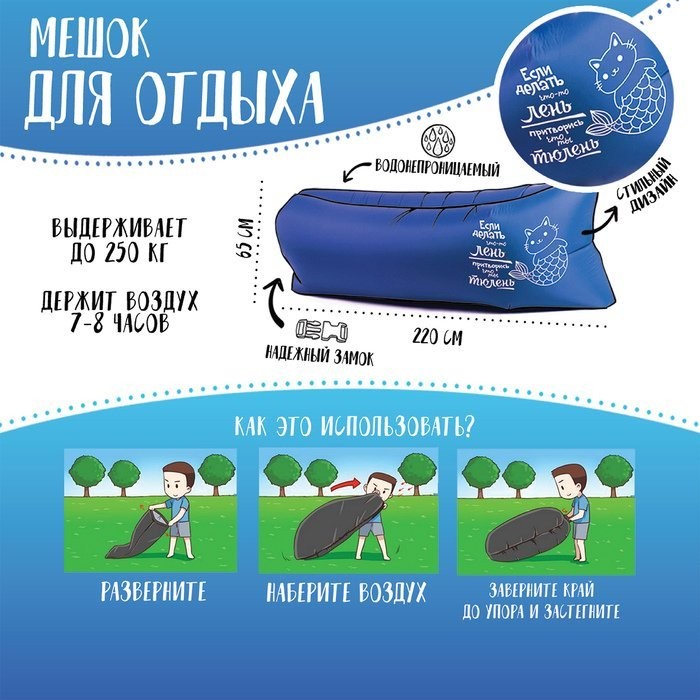 - Благодаря водостойкости удобно использовать вместо пляжного надувного матраса, ведь надувной мешок превосходно держится на воде