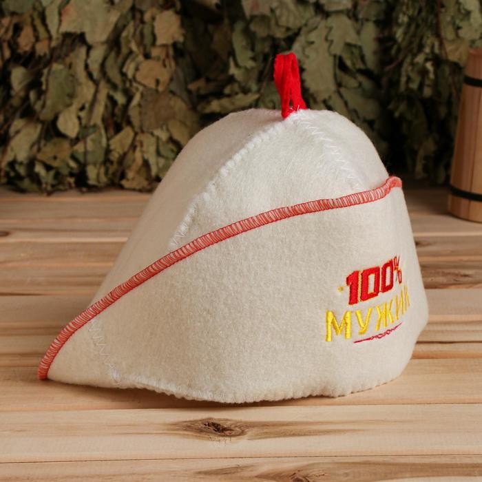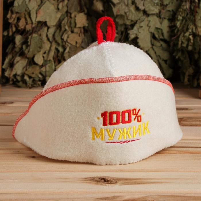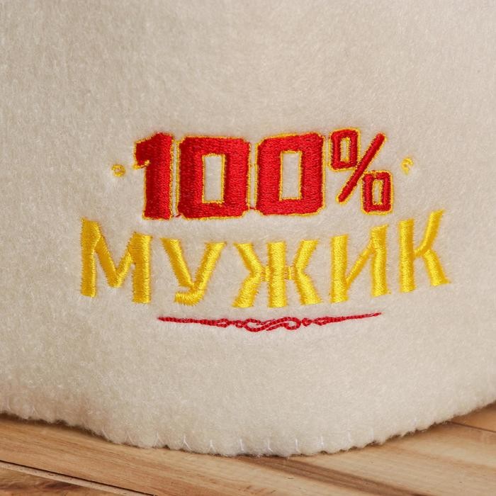 Шапка для бани с отворотом «100% мужик» с вышивкой, белая, войлок
